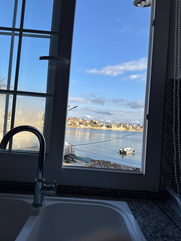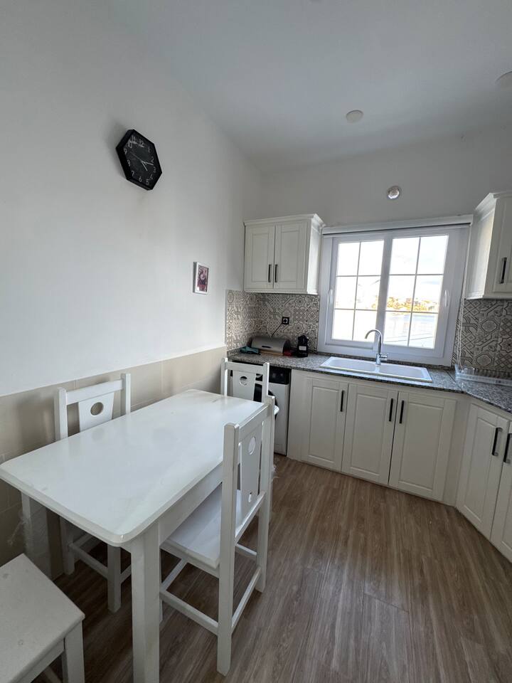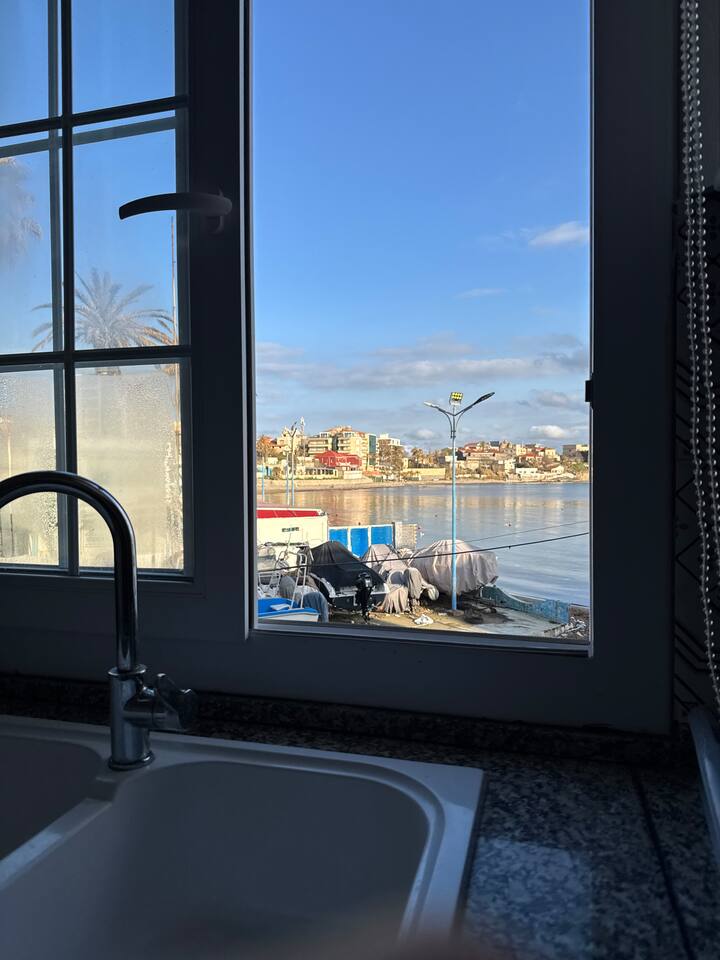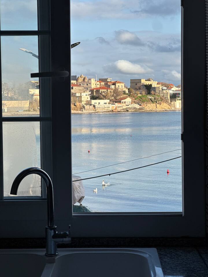Appartement pieds dans l'eau à La Pérouse, Alger. Vue mer depuis le salon, accès plage à 1 min à pied. 5 voyageurs, 4 lits, WiFi fibre, cuisine équipée, lave-linge. Quartier calme et résidentiel, idéal pour familles et couples. Check-in autonome par boîte à clés.